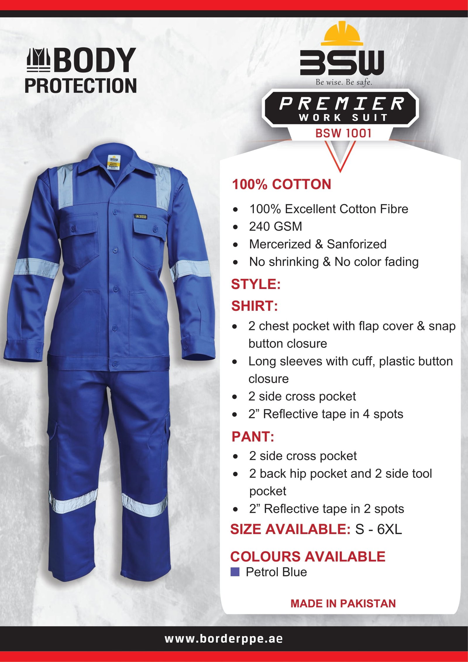 The BSW Premier Work Suit (BSW 1001) is a robust two-piece industrial garment set designed to deliver comfort, durability, and professional appearance across a wide range of industrial applications. Constructed using 100% excellent cotton fabric with a 240 GSM weight, this work suit offers excellent breathability while maintaining strength for prolonged use. The fabric undergoes mercerization and sanforization processes, ensuring resistance to shrinkage and colour loss. The shirt features functional chest pockets with flap and snap button closures, while the pants include multiple storage options and reinforced seams for added durability. Reflective tape placement improves visibility and safety, especially in low-light work conditions. This work suit is ideal for technicians, maintenance crews, and industrial workers seeking a reliable, long-lasting uniform with a professional finish.